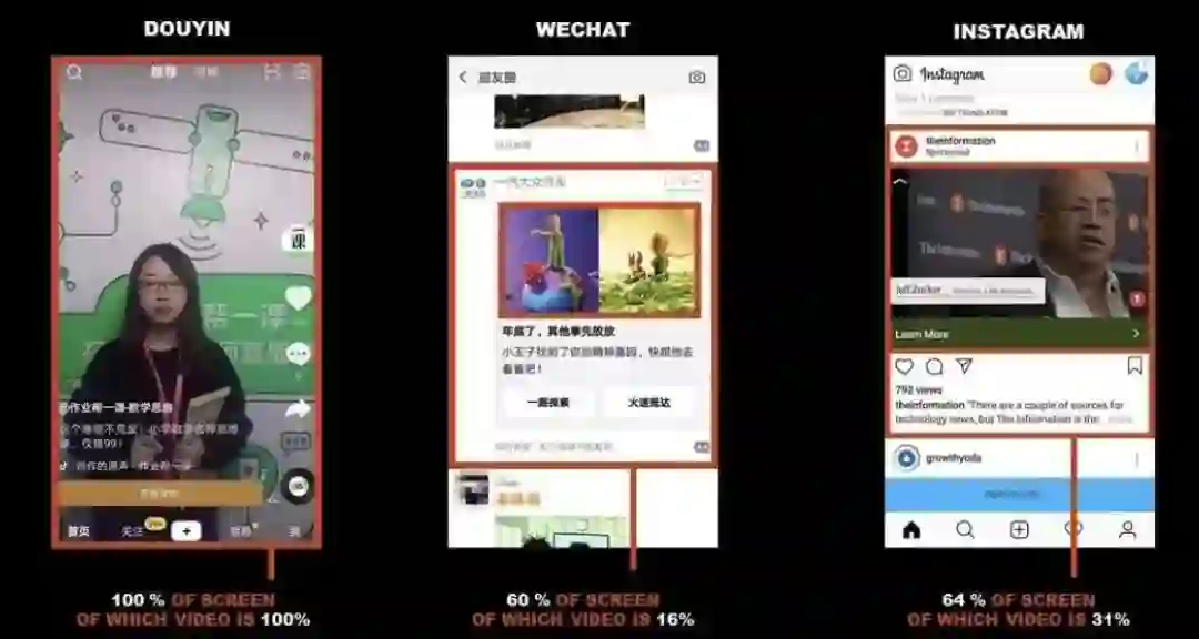 对于广告主而言,屏幕的“坪效比”是重要考量因素。可以看到,甚至最知名的Instagram也浪费了屏幕的空间。当我们面对一位广告主做沟通时,他会更喜欢上面这几个屏幕中哪种形式的视频或广告?是会选择100%的TikTok屏幕,还是16%的WeChat,或者31%的Instagram呢?