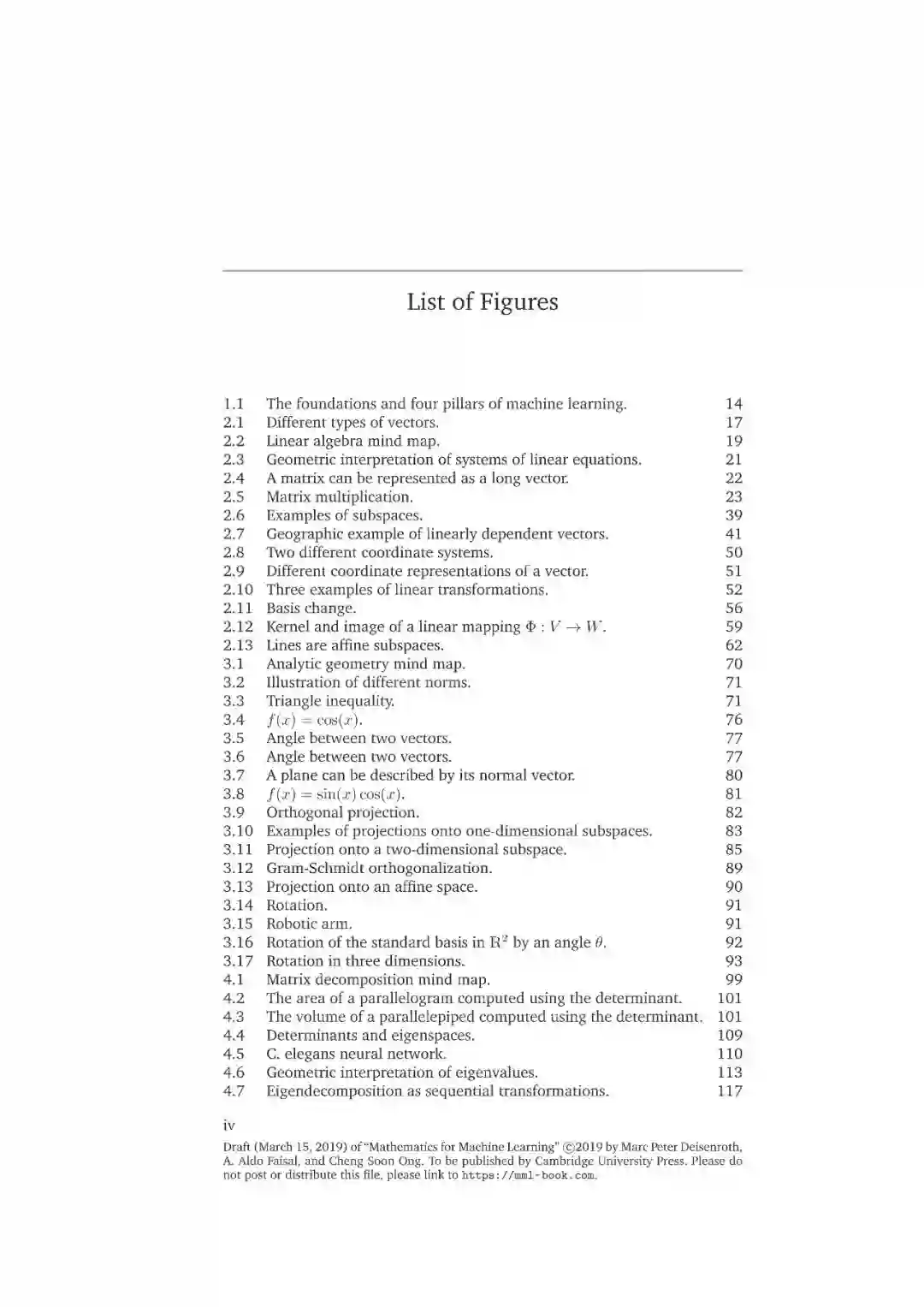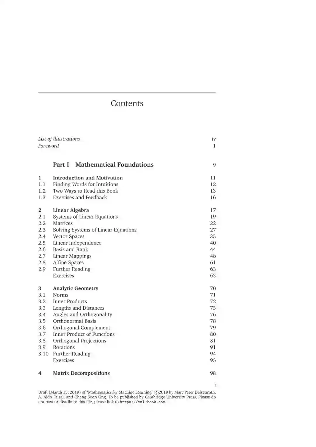 这本书的第一部分描述了关于机器学习系统的三个主要组成部分的数学概念和数学基础:数据、模型和学习。在本书中,作者假设数据已经被适当地转换成适合于阅读的数字表示形式,并被转换成计算机程序。在这本书中,作者认为数据是向量。模型是现实世界的简化版本,它捕获与任务相关的现实世界的各个方面。模型的用户需要理解模型没有捕捉到什么,从而理解模型的局限性。概括起来就是,作者使用领域知识将数据表示为向量。并选择一个合适的模型,要么使用概率方法,要么使用优化方法。采用数值优化的方法,对过去的数据进行学习,目的是它在看不见的数据上表现良好。