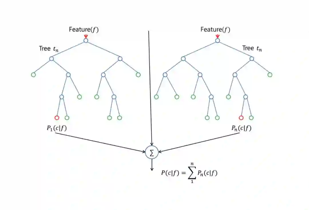 例如,如果您想预测某人是否会点击在线广告,则可以收集该广告的过去点击人员以及描述其决定的某些功能。如果将特征和标签放入决策树中,它将生成节点和一些规则。然后你可以预测广告是否会被点击。当决策树生成节点和规则时,它通常使用信息增益和基尼指数计算。相比之下,随机森林是随机的。