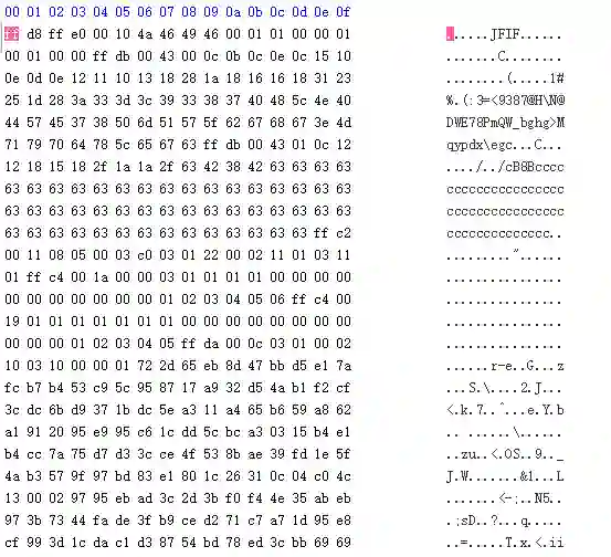 假如说你把 .jpg 的文件后缀改成了 .txt 那么当你用记事本去打开的时候就会呈现一堆乱码。。。