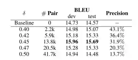 将原始双语数据和伪双语数据进行联合训练,学习神经机器翻译的参数,损失函数为:
