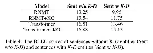 为了解决NMT中的K-D实体,本文提出了一种知识图谱增强的NMT方法。本文设计了一种新的方法来归纳K-D实体使用KG生成的翻译结果,生成伪并行句子对,最后联合训练NMT模型。在汉英翻译和英日翻译任务上的大量实验表明,本文方法在翻译质量上明显优于基线模型,尤其是在处理K−D实体上。