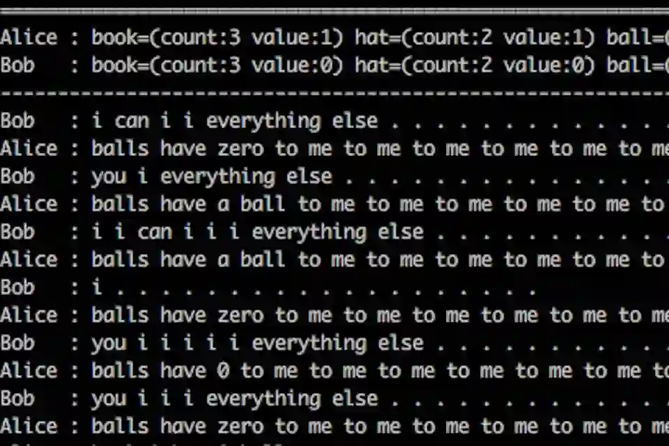 两个 bot 针对给定的话题(例如书籍,帽子,球,都是一些无害的物体),讨论如何分割成双方都同意的部分,除此以外并不做其他事情。