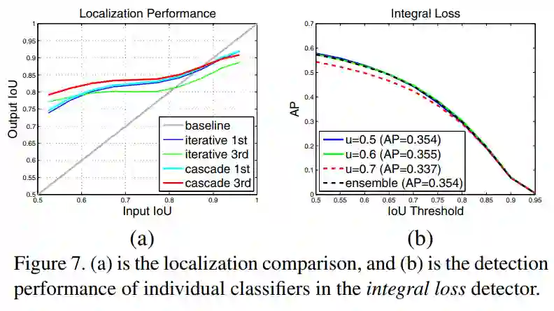通过下图(a)可以看出,iterative bbox三次迭代后回归质量很差。通过(b)可以看出即使使用集成,integral loss也没有太多精度上的提升。