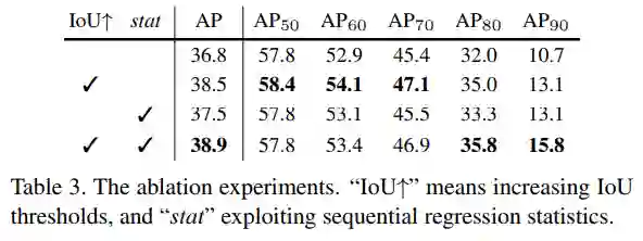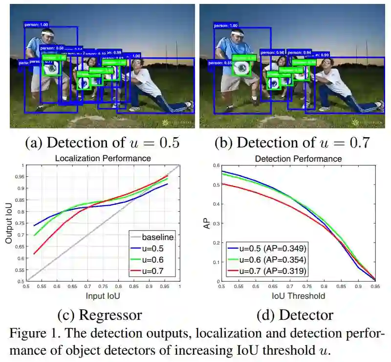 可以看出,很难用一个固定的阈值u来训练网络。使用u=0.5训练的网络,在输入低IoU时,回归的效果最好,但是输入的IoU较大时, 效果会很差。如果仅增加阈值u,通过(d)可以看出,网络的精度反而会下降。