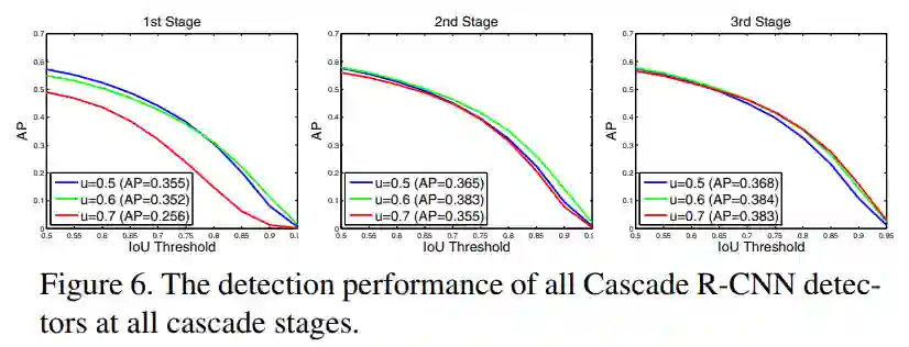 通过(c),可以发现,输入到(2)中proposals的IoU与网络训练时使用的阈值u比较接近时,回归器的表现更好。因此作者提出了一个很巧妙的想法:训练多个阈值递增的检测器,每个检测器使用上一级输出的bbox回归结果,如Figure 3 (d)所示。这样每一级检测器都有足够多的高质量(高IoU)样本进行训练,并且回归的bbox也会越来越准确。