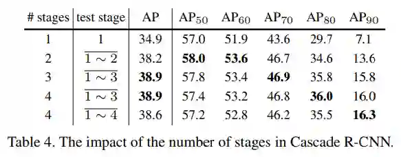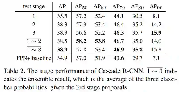 测试Cascade R-CNN中每个阶段每个检测器的精度。