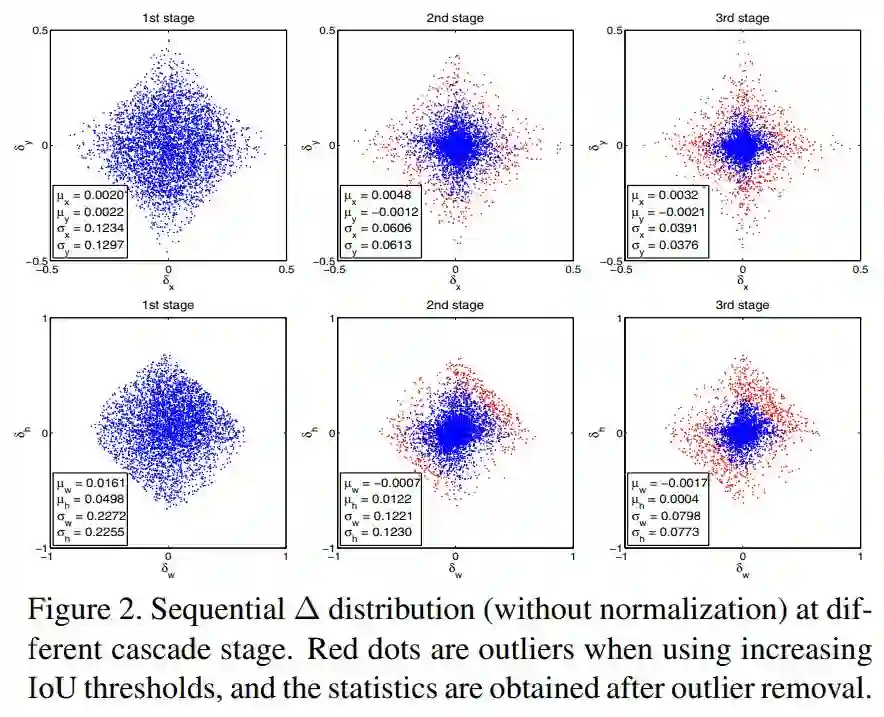 这样做存在两个问题: (1)从Figure 1 (c)中可以看出,使用u=0.5训练的检测器H1,对于下次输入的高质量IoU,再次回归结果通常并不是最优的,当输入的proposals的IoU>0.85时,回归结果反而会下降; (2)作者实验发现,每次迭代后输出的bbox分布都会有很大的变化,如Figure 2所示,检测器对第一阶段后的数据分布预测效果不是最好的。