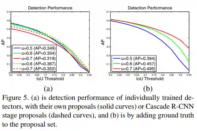 图(a)中实线表示不同阈值的单检测器精度。图(b)为输入proposals中加入真实bbox的结果。图(a)中虚线为分别用二,三阶段级联检测器预测的bbox代替原始的proposals的结果。