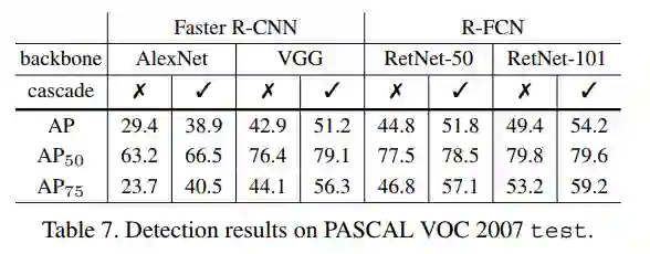各方法检测精度对比,Cascade R-CNN 在高阈值的评估规则下效果很好。