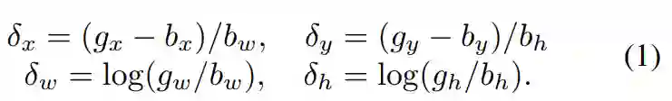 回顾一下bbox回归的过程。边框坐标 b=(bx,by,bw,bh ),表示图像 x 的中心坐标和宽高,另候选区域坐标为 b,真实坐标为 g,那么 bbox 回归可以用公式表示为 gi=f(x,bi),损失函数表示为 Lloc (f(x,bi ),gi)。为了保证回归尺度和位置的不变性,通常对偏移量 Δ=(δx,δy,δw,δh ) 进行回归,具体定义