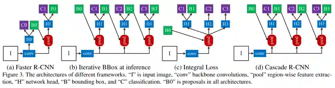 其中H0为检测的第一阶段,图中所有的B0均是第一阶段输出的proposals;H1,H2等为检测器,负责对输入的proposals进行分类和bbox回归。