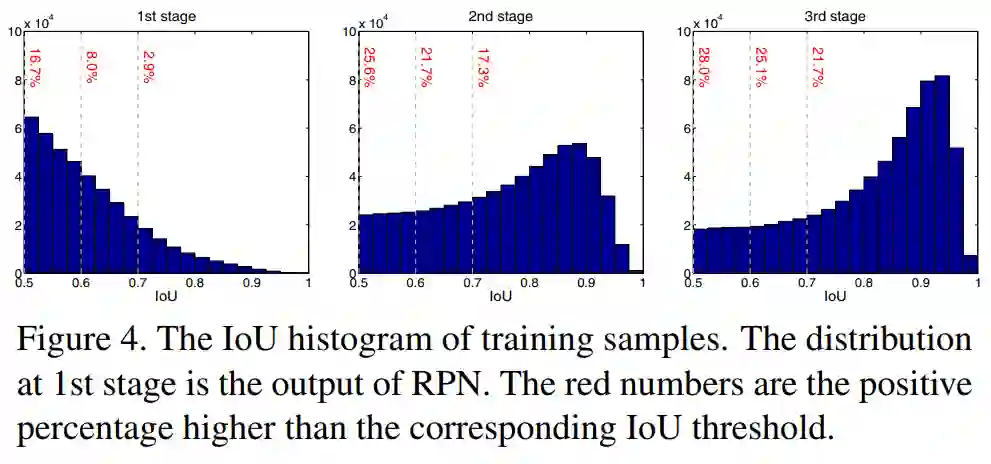 作者通过实验发现,这种做法效果也不好,如Figure 4所示,在一阶段,不同IoU阈值u对应的正样本数量差别很大,导致使用高阈值u训练的分类器容易过拟合。