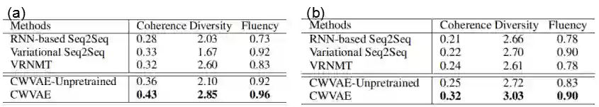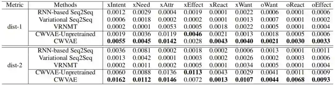 (1) 通过将基于变分的Variational Seq2Seq,VRNMT, CWVAE-unpretrained以及 CWVAE与其他基于RNN Seq2Seq的模型发现,基于变分法的模型生成的多样性总体而言高于其他基于RNN Seq2Seq的模型。这确认了采用基于变分的模型提高生成多样性的合理性 。