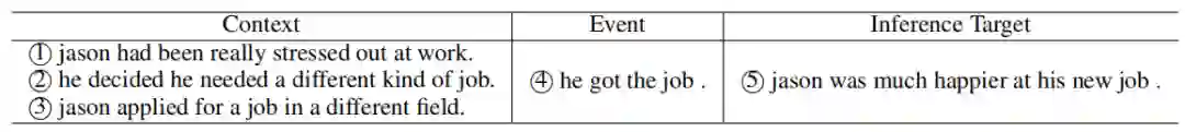 辅助数据集基于三个故事数据集构建:ROCStory(Mostafazadeh等人,2016), VIST(Huang等人,2016),WritingPrompts(Fan等人, 2018)。我们将上述数据集中的每个故事分成长为5句话的子段落,并将每个子段落的前三句话定义为base event的上下文,第四句话定义为base event,第五句定义为target。表3给出了一个例子。
