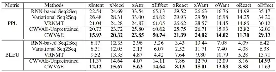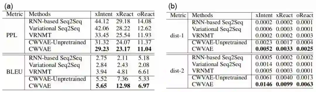 表4--6展示了CWVAE与基线方法在Event2Mind与Atomic上的BLEU与困惑度,以及distinct-1与distinct-2指标。从中可以观察得出: