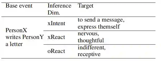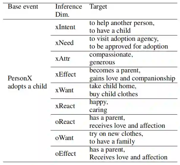 Atomic数据集相比于Event2Mind规模更大。表2展示了一个Atomic中的例子。尽管Atomic同时包含Event2Mind中的inference dimension,二者的base event并不完全相同。