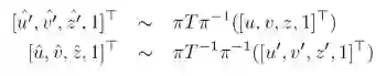 式中 u'^表示 u 到第二张图片的投影,而 u^ 代表 u』 到第一张图片的投影。式中,π:R^4→R^4 表示将相机的 3D 坐标 [x,y,z,1]^T 映射到像素位置(并加上深度值)的透视投影运算: