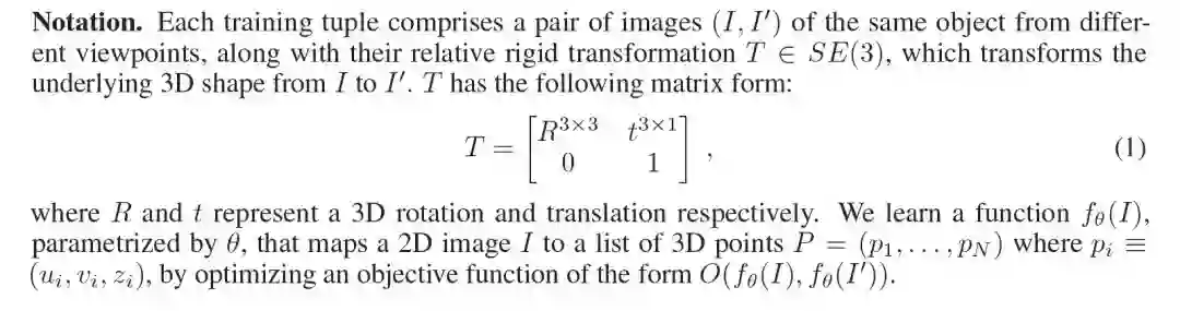(1) 式中 R 和 t 分别表示 3D 旋转 (rotation) 和转换 (translation)。我们想要学习一个函数 f_θ(I),并通过优化它的目标函数 O(f_θ(I), f_θ(I')),用于完成从一张 2D 图像 I 到一个 3D 关键点列表 P = (p_1,…p_n) 的映射,其中,p_i =(u_i,v_i,z_i)。