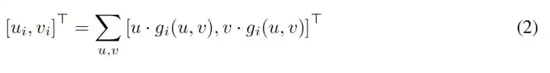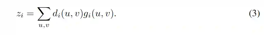 值得注意的是,图像到关键点映射的一个重要特性是,像素级的等效转换(translation equivariance)。例如,如果输入图像向左移动了一个像素,所有关键点的输出位置也应该改变一个单位。KeypointNet 使用空间 softmax 层 (spatial softmax layer),输出一个概率分布 g_i (u,v),用于表示关键点 i 在像素(u,v)处出现的可能性。利用等式(2),可以利用空间分布的期望值(expected values of the spatial distributions),计算出恢复后的像素坐标。