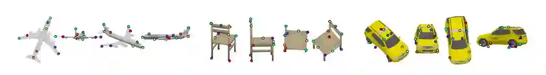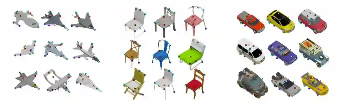 图 3:KeypointNet 在 ShapeNet [5] 汽车、飞机和椅子三个类别取得的关键点预测结果。KeypointNet 在面对训练中未曾见过的图片实例时(而这些实例在外观和形状存在各种变化),仍旧能够预测物体被遮挡的部分,例如轮子和椅子腿。