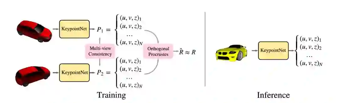 图 1:在训练 (training) 过程中,将同一个物体的两个视角图像作为 KeypointNet 的输入。两个视角之间的刚体变化(R,t)是指导信号 (supervisory signal)。KeypointNet 优化了在两个视角中有一致性,并且能够用于刚体变化恢复的,3D 关键点的有序列表。而在推理 (inference) 过程中,KeypointNet 将从单一输入图像中提取了 3D 关键点,再进行物体类型的识别。