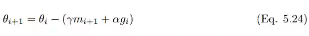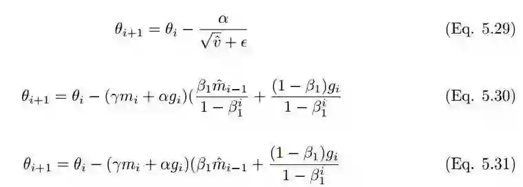 Nadam 是 NAG 和 Adam 优化器的结合 [28]。如果过往历史平方梯度的指数衰减平均值为 v_t,而过往历史梯度的指数衰减平均值为 m_t,那么经典动量更新规则如下: