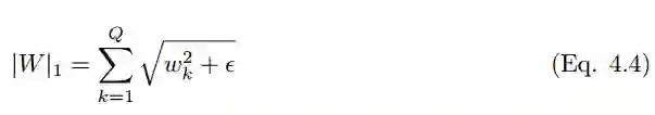 L1 正则化在零点不可微,因此权重以趋近于零的常数因子增长。很多神经网络在权重衰减公式中使用一阶步骤来解决非凸 L1 正则化问题 [19]。L1 范数的近似变体是: