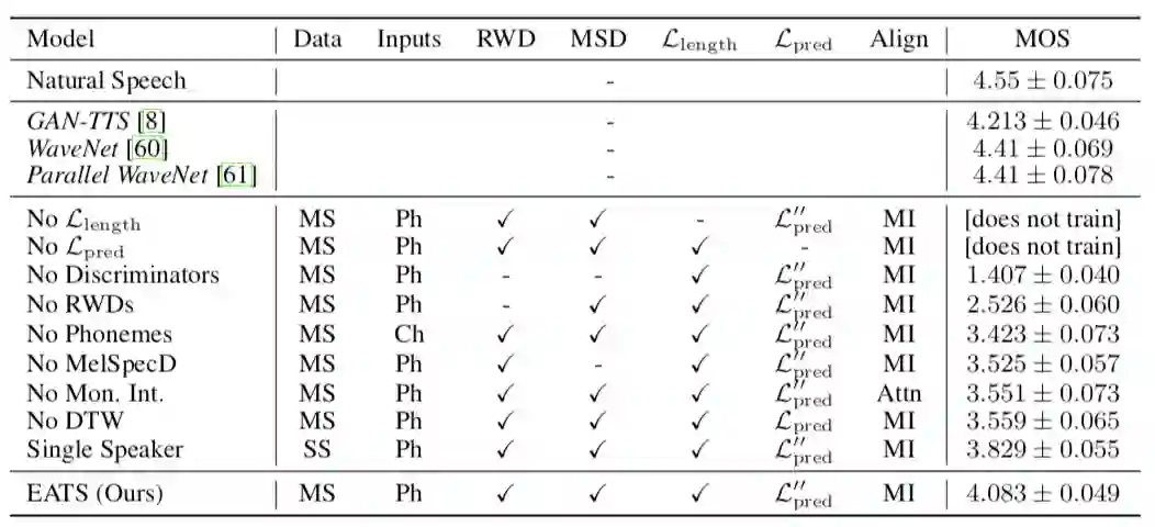 最终,与仅用单个说话人(MOS 值 3.829)的训练做比较后发现,EATS 模型从更大的多说话人数据集中获益,尽管它的 MOS 值是基于只有一个说话人的控制变量研究的训练语音评估得到的。