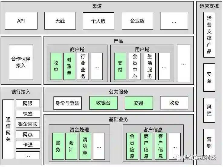 基础业务层:支付系统的核心,资金和客户信息的处理都在这里。一般会划分三大子系统:帐务核心、会计核心、会员核心。