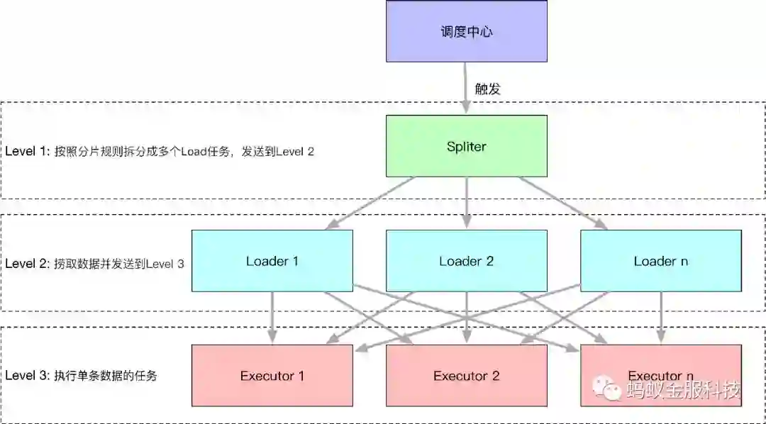 前面提到各条流水数据之间没有关联的,完全可以并发的进行处理,每个Server捞取一个分片的数据进行处理。那么就需要有一个很好的调度系统来协调,可以采用三层调度的方式。