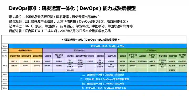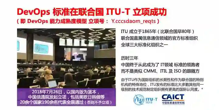 目前,由中国信息通信研究院主导的DevOps 标准已在联合国直属标准化组织 ITU-T、中国通信标准化协会(CCSA)正式立项。