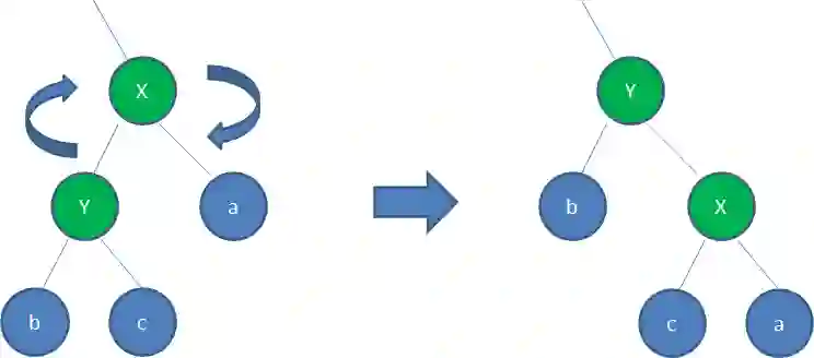 图中,身为左孩子的Y取代了X的位置,而X变成了自己的右孩子。此为右旋转。