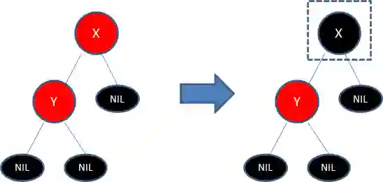 下图所表示的是红黑树的一部分(子树),新插入的结点Y是红色结点,它的父亲结点X也是红色的,不符合规则4,因此我们可以把结点X从红色变成黑色:
