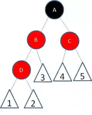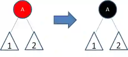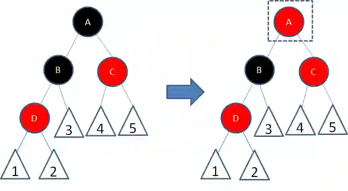 这样一来,结点B所在路径凭空多了一个黑色结点,打破了规则5。因此我们让结点A变为红色: