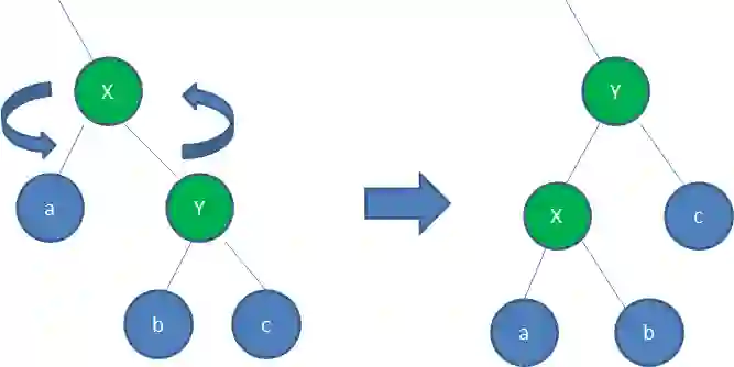 图中,身为右孩子的Y取代了X的位置,而X变成了自己的左孩子。此为左旋转。