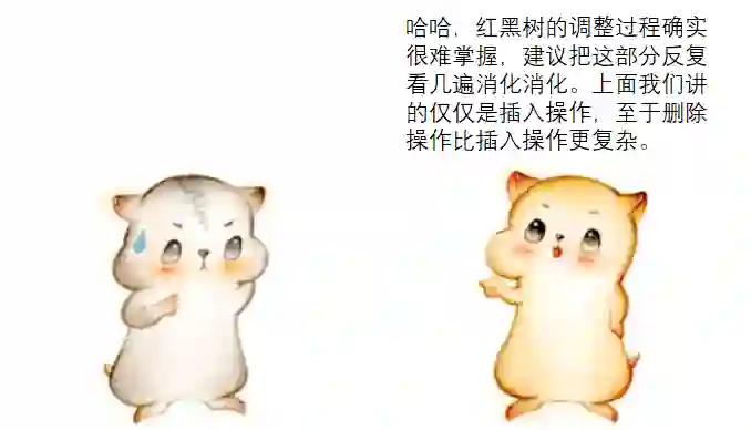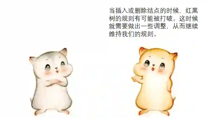 但是,仅仅把一个结点变色,会导致相关路径凭空多出一个黑色结点,这样就打破了规则5。因此,我们需要对其他结点做进一步的调整,后文会详细说明。