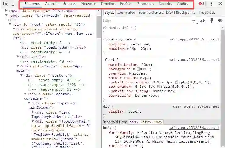 目前任意一款浏览器基本上都具备这个功能,只要在你浏览的网页上右键然后点击审查元素即可出现WDT(Web Development Tools)界面,界面最上面一栏显示包括元素、控制台、来源、网络、时间线、运行概况、资源、安全和审计8个面板,对于网络数据抓取而言只需要重点关注元素和网络这两大面板即可。