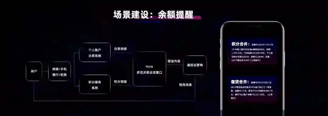 在余额变动场景,客户进行一次动账交易,可能触发多种通知内容,例如账户支出提醒、账户收入提醒、积分消费提醒等,造成客户手机连续收到短信提醒,用户体验不佳。因此,工行基于 Flink 多流合并和会话窗口的能力,将同一时刻发生的多条消息关联,将通知的逻辑合并在一起发送给客户。而当一条消息出现晚到的情况,通过会话窗口的 GAP 设置能自动降级,将逻辑分为两条消息发出去。大幅提升对用户的友好性。