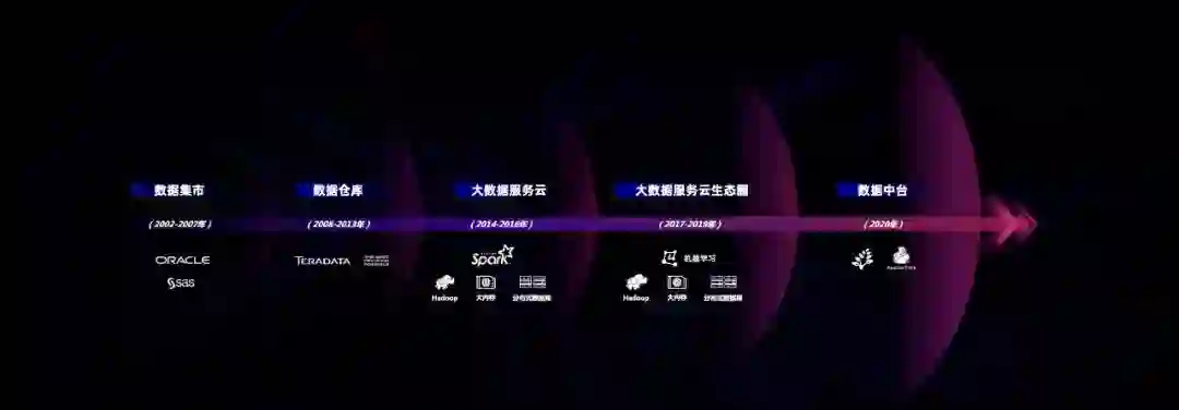 工商银行从 2002 年开始建设数据集市,当时主要使用 Oracle 类单机版的关系型数据库。随着数据量不断增加,开始引入 TD、ED 等国外高端一体机。2014 年工行正式基于 Hadoop 技术建设了大数据平台,在其之上构建了企业级数据湖及数据仓库。2017 年,随着 AI 技术的兴起,又开始建设机器学习平台,2020 年开始建设数据中台和高时效类场景。