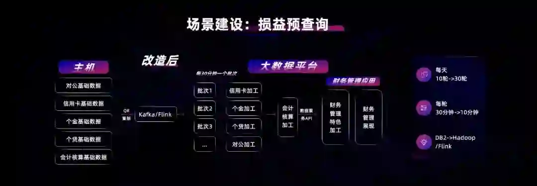 因此工行做了架构改造,通过 CDC 数据复制技术,将主机实时发生的数据复制到大数据平台,通过 Flink 进行实时 ETL,数据搬运过来之后,充分利用大数据平台海量的计算能力,大幅提升预查询效率。原来每天跑 10 轮,现在每天可以跑 30 轮,原来每轮 30 分钟,现在每轮只要 10 分钟,既提升了时效又节省了成本。