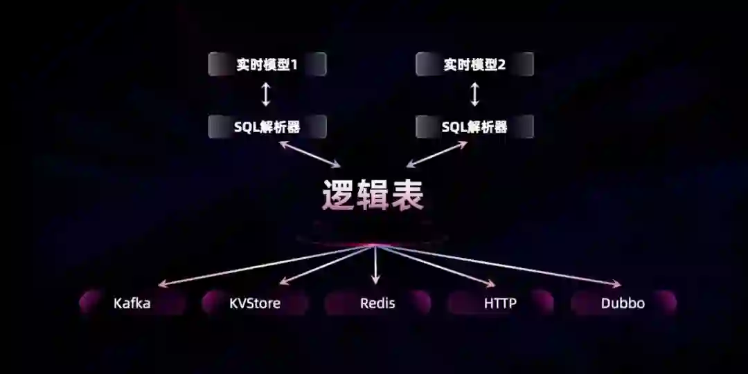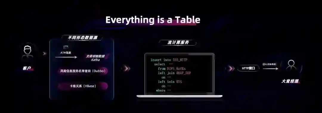 工行将调用的 HTTP、Dubbo、Redis 等外部接口,抽象成一张张外部表。直接通过一句 SQL 就能将 Kafka 中的流表与 Dubbo 的维表关联,然后将结果送到 HTTP 接口,大幅提升开发效率。
