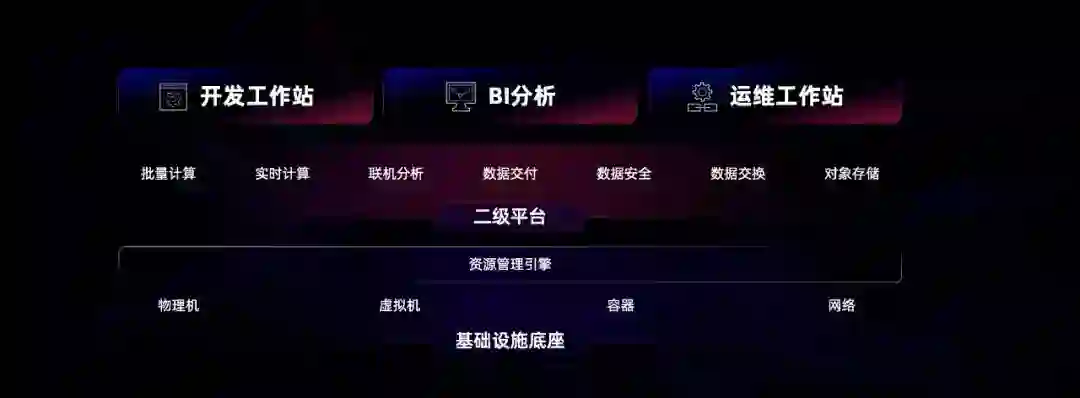 为了满足数据时效,以及企业级大规模普惠用数的诉求,企业内部的大数据平台需要不仅支持批量计算,还需要满足各类用数场景全栈覆盖的技术体系。以工行为例,大数据平台内部除批量计算之外,包含实时计算,联机分析、数据 API 等平台,主要以 Flink 作为内部引擎,用于缩短数据端到端闭环时间,形成联机高并发的访问能力,提升数据赋能业务的时效。除此之外,还包含数据交换、数据安全等面向特定技术领域的二级平台。在最上面一层,我们向开发人员、数据分析师、运维人员提供了可视化的支撑工具。