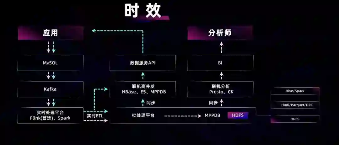 粉色链路的数据,最终回到数据分析师那里,是蓝色链路的衍生。各个应用产生的数据,通过 Flink 和 HUDI 的实时数据入湖,通过 Presto 或 CK 等分析型引擎,供数据分析师进行 BI 分析。通过这条链路,数据时效得以提升,让分析师访问到分钟级延时的热数据,更加实时、准确地做出运营决策。一般高时效的业务场景,都包含在这条技术链路的体系之内。