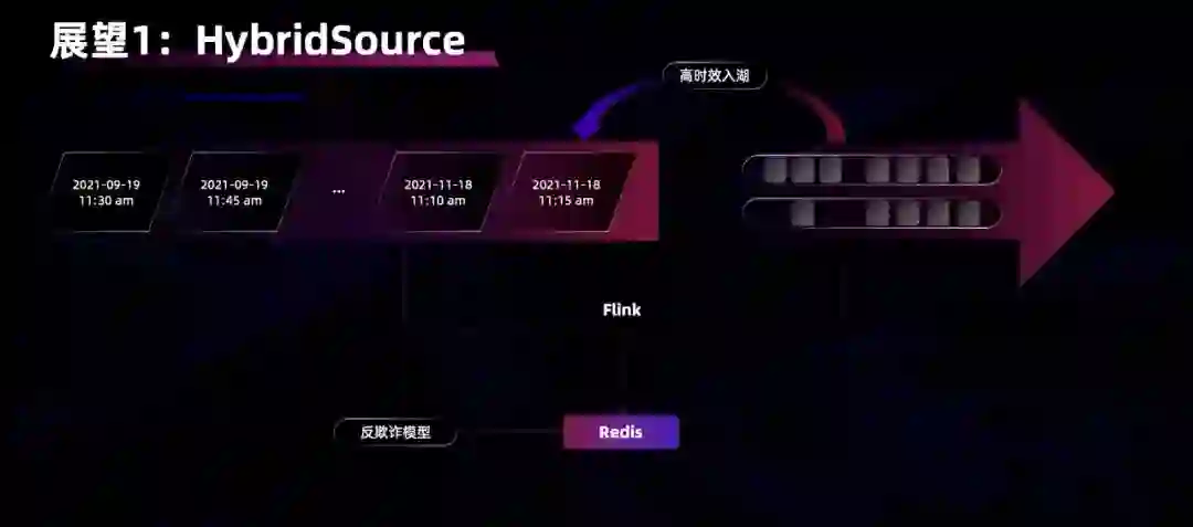 我们先来讲讲 Flink 1.14 版本中发布的 HybridSource 能力。目前,在上线一新的实时模型时,如果涉及到历史数据的统计指标,以金融行业为例,在一个反欺诈模型里,需要最近 7 天累计交易额的统计指标。这种情况下,我们一般会先跑 Hive,批量算出前 6 天的统计值,放进 Redis,然后基于 Flink 读取 Kafka 中的数据,统计当天的增量数据,再进一步汇总成最近 7 天的统计值。这个过程,需要分两个作业来实现。