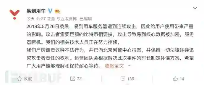 5月26日中午,易到用车微博发布消息称,服务器连续遭到攻击,导致核心数据被加密、服务器宕机,攻击者还要求支付巨额比特币,截止笔者发稿之时易到官网、手机APP仍然处于故障中。