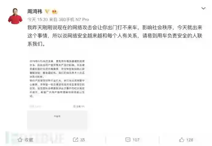 在得知易到用车遭遇勒索攻击的消息之后,360“红衣教主”周鸿祎表示“网络安全越来越和每个人有关系”,还隔空喊话让易到用车的安全负责人与360联系,或许也会提供安全援助。