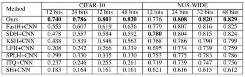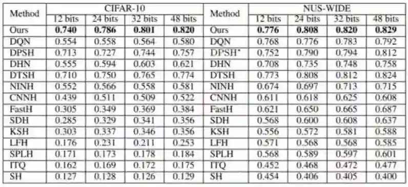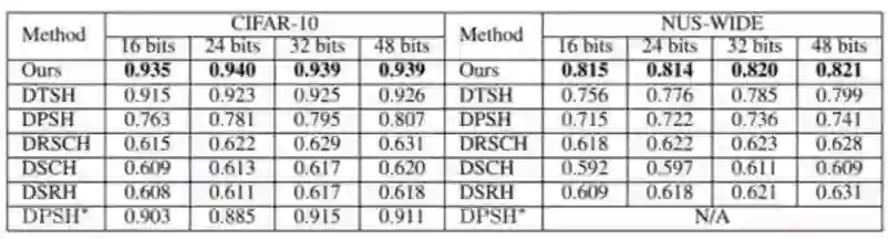 表 1:第一组实验设置下不同方法的 MAP。NUS-WIDE 数据集的 MAP 是根据返回的前 5,000 位邻近值计算的。DPSH * 表示重新运行 DPSH 作者提供的代码。