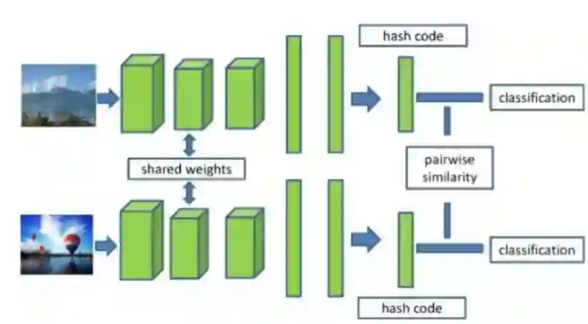近期有人提出了基于深度学习的哈希算法,它可以同时学习图像表示和哈希编码(hash coding),取得了比传统哈希算法更好的结果。「CNNH」[19] 是早期将深层神经网络与哈希编码融合的工作之一,该工作包括两个阶段来学习图像特征表示和哈希编码。CNNH 的一个缺点是通过学习得到的图像特征表示不能及时反馈给哈希编码。为了克服 CNNH 的这一缺陷,「Network In Network Hashing/NINH」[8] 提出了基于三元组损失函数来表示图像的相似性。研究表明,图像特征表示和哈希编码可以在一个框架内相互促进。「DSRH」算法 [24] 通过保留多标签图像间的相似语义信息来学习哈希函数。近年来还提出了其他基于排序的深度哈希算法 [17,21]。除了基于三元组排序方法外,还有一些基于成对标签的深度哈希算法 [9,25]。