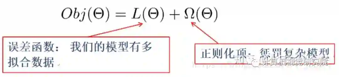 其中,误差/损失函数鼓励我们的模型尽量去拟合训练数据,使得最后的模型会有比较少的 bias。而正则化项则鼓励更加简单的模型。因为当模型简单之后,有限数据拟合出来结果的随机性比较小,不容易过拟合,使得最后模型的预测更加稳定。